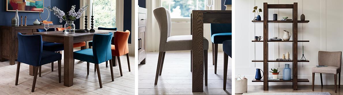 Designed for relaxed living and dining, the versatile Havana range makes it easy to create the perfect room setting. Mix and match different sized dining tables with slatted-back or upholstered low-back chairs and add a sideboard, display unit or coffee table to complete the look. Crafted from dark-oiled knotty American oak and oak veneers and featuring a refined geometric aesthetic that's perfect for your contemporary home.